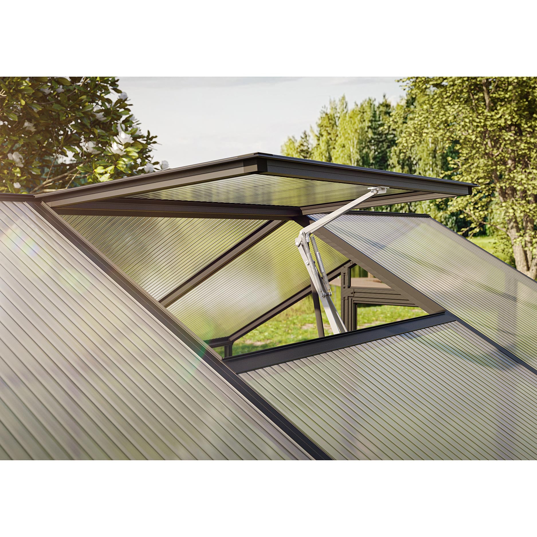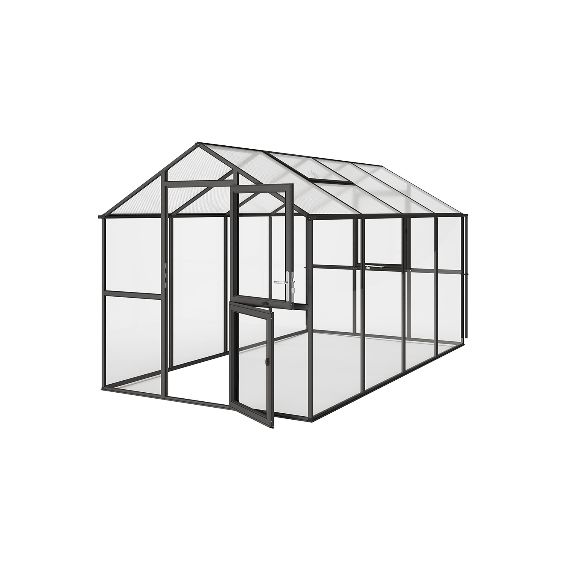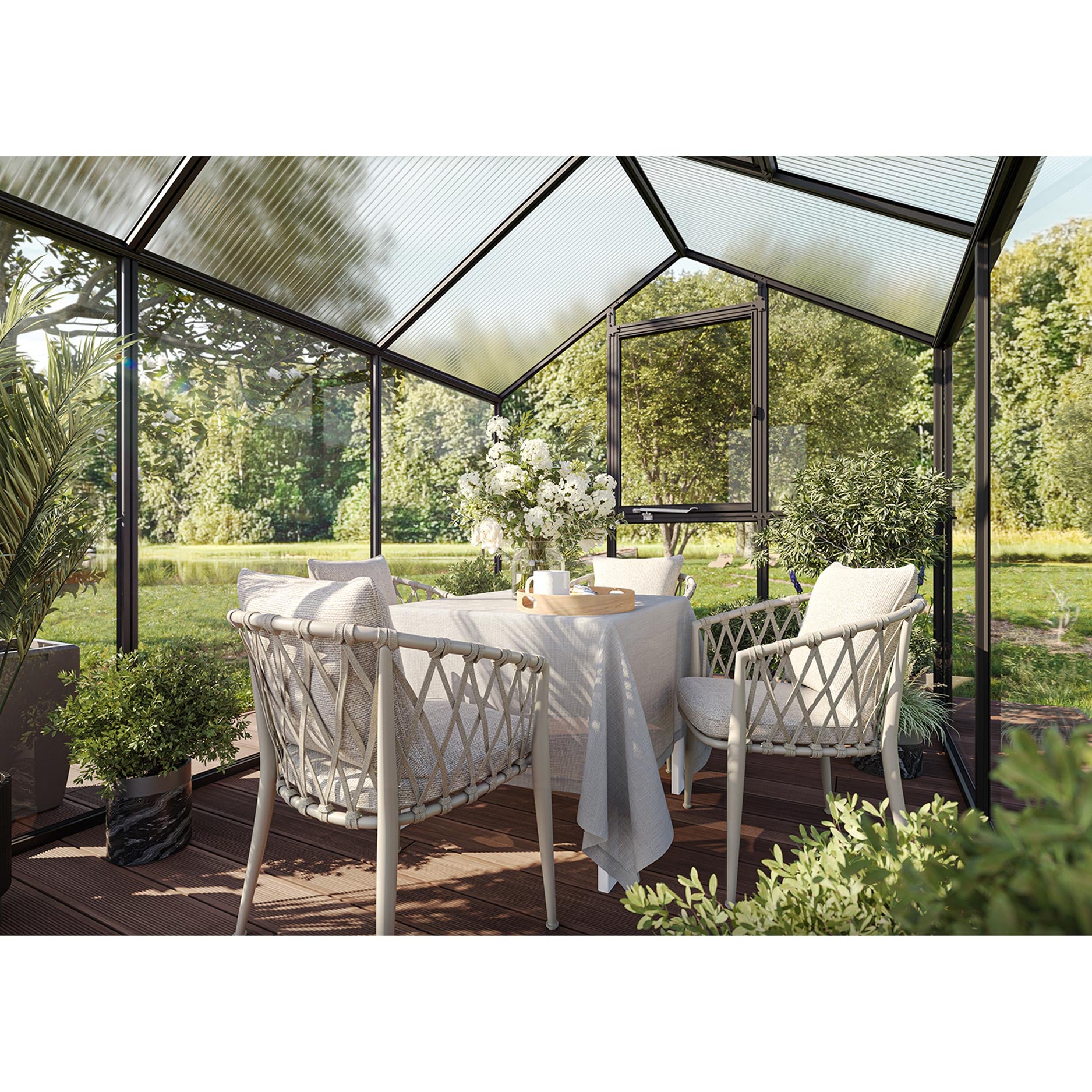 De 4mm veiligheidsglaswanden zorgen voor helder zicht en een elegante uitstraling, terwijl het dak met 10mm kanaalplaten zorgt voor isolatie en bescherming tegen oververhitting. De aluminiumconstructie is bijzonder stabiel en bestand tegen weersinvloeden. De Aptasia IV is voorzien van een brede draaideur, een automatisch dakraam, een handmatig achterraam en geïntegreerde regengoten met aluminium regenpijpen. Het optionele funderingsframe biedt extra stevigheid en duurzaamheid.