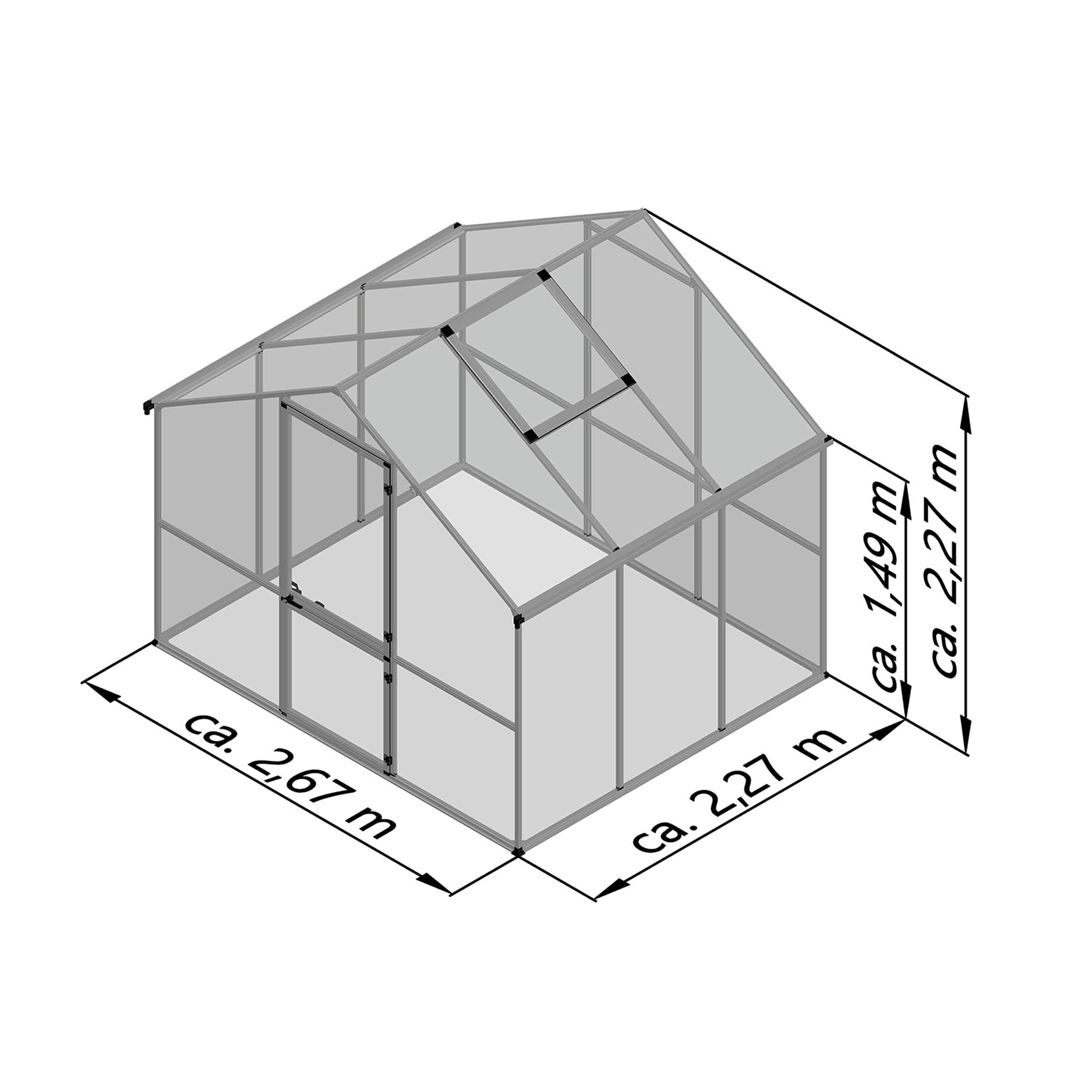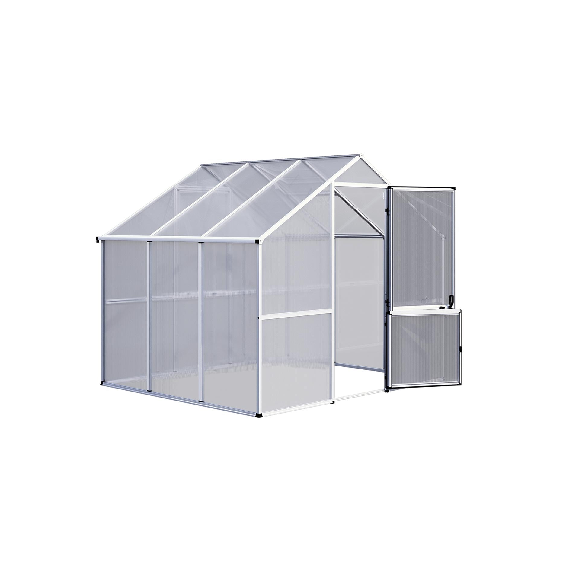 De kas heeft een stevige aluminiumconstructie met 6mm kanaalplaten die isolerend en UV-beschermd zijn. Deze platen houden warmte beter vast en verdelen het zonlicht gelijkmatig, wat de groei bevordert en het risico op verbranding vermindert. De schuifdeur loopt soepel en maakt de kas goed toegankelijk, zelfs bij beperkte ruimte voor de ingang. Het dakraam reguleert ventilatie en luchtvochtigheid, en de geïntegreerde regengoten zorgen voor afvoer of opvang van regenwater. Met het optionele funderingsframe staat de kas stevig verankerd, zelfs bij wisselende ondergrond.