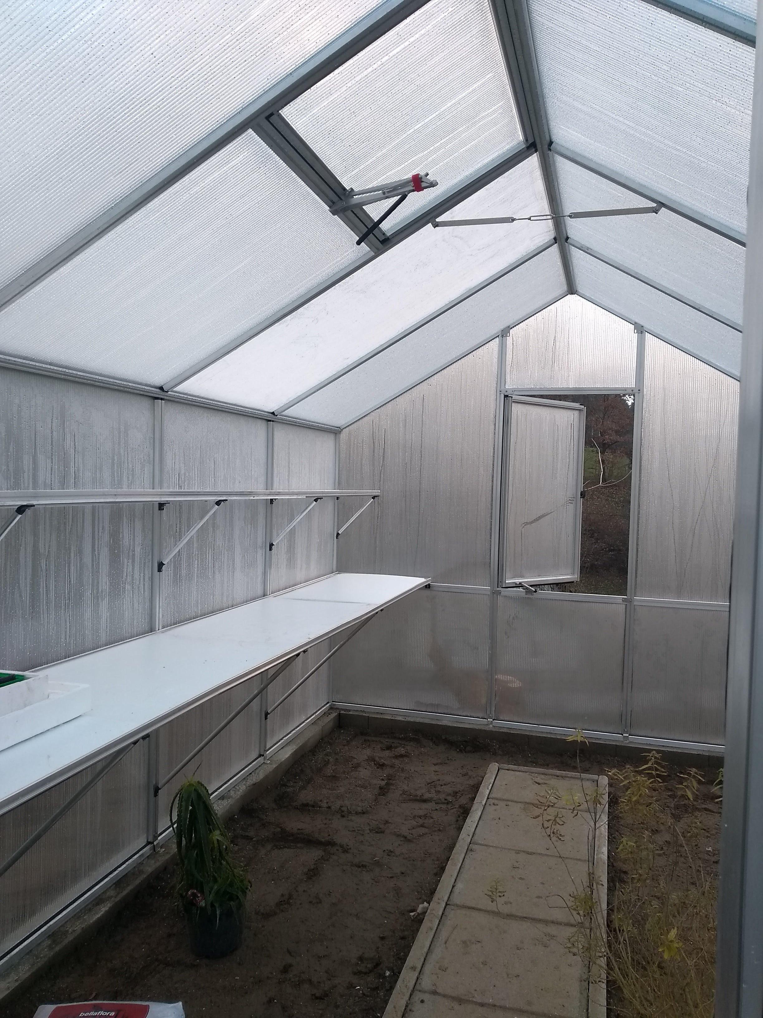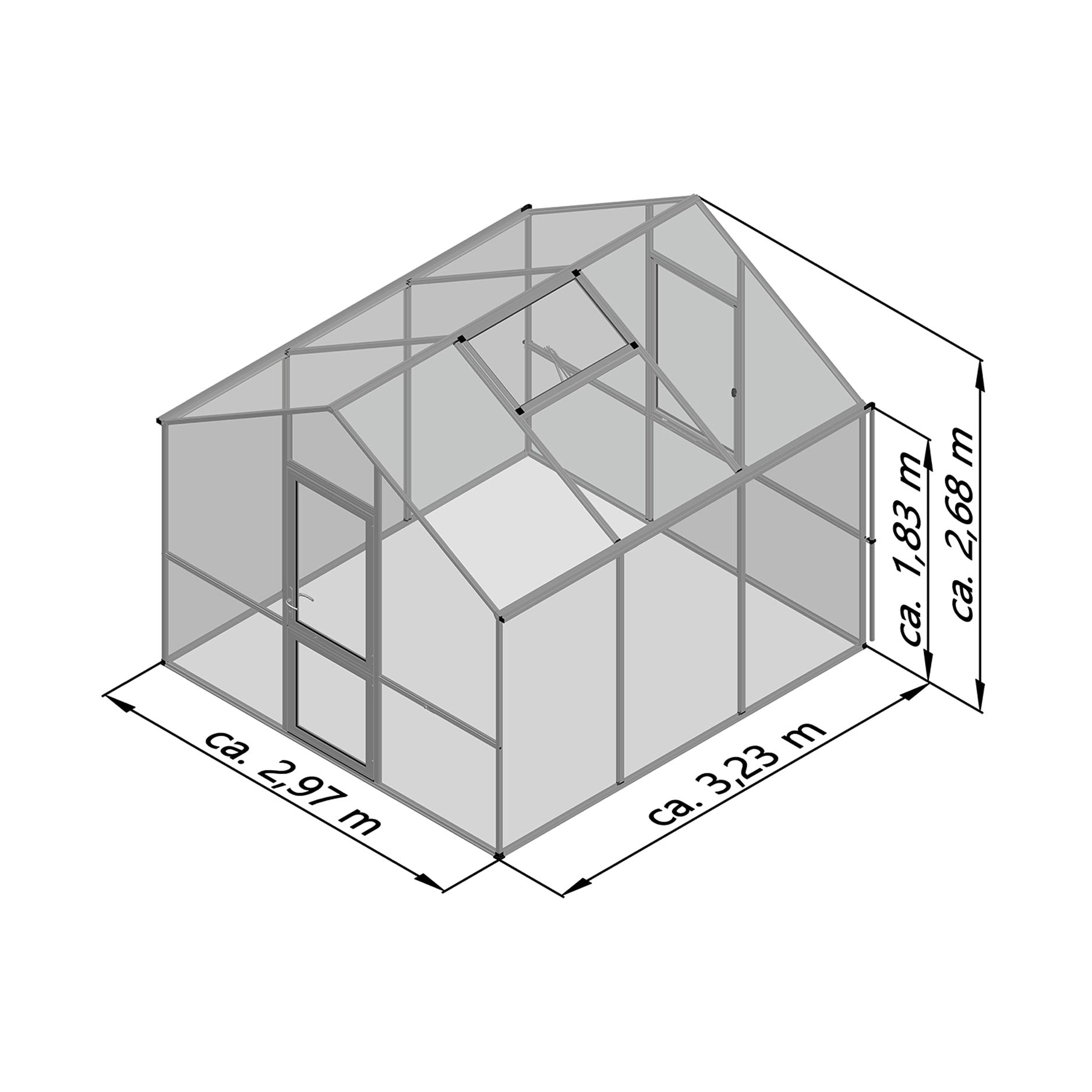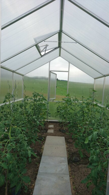 De constructie bestaat uit een sterke, onderhoudsarme aluminiumconstructie met 10 mm kanaalplaten die een uitstekende isolatie en lichtverdeling garanderen. De platen zijn UV-beschermd, waardoor ze jarenlang helder blijven en je planten niet verbranden bij felle zon. Dankzij de goede isolatiewaarde blijft de temperatuur binnen langer constant, wat het groeiseizoen aanzienlijk verlengt. De kas is uitgerust met een brede draaideur, een dakraam met automatische opener en een handmatig achterraam voor luchtcirculatie. Regengoten aan beide zijden voeren neerslag af of maken aansluiting op een opvangsysteem mogelijk. Met het optionele funderingsframe staat de kas stevig verankerd, ook bij windbelasting of zachte ondergrond.