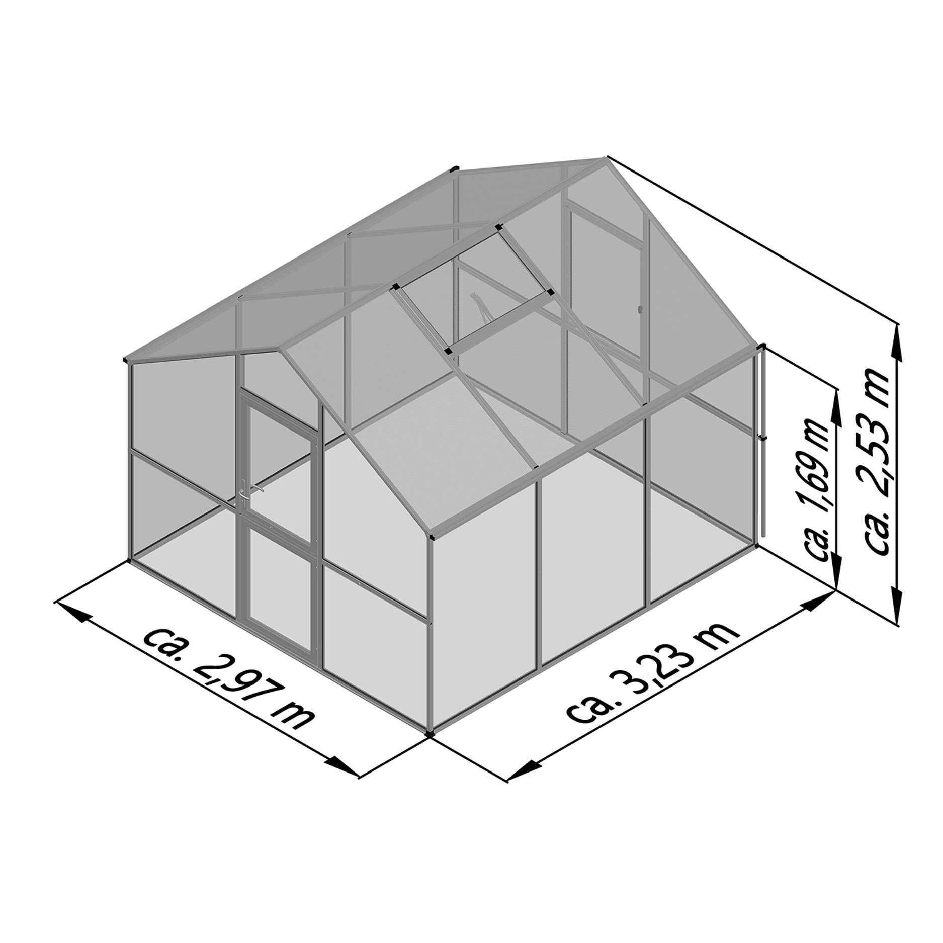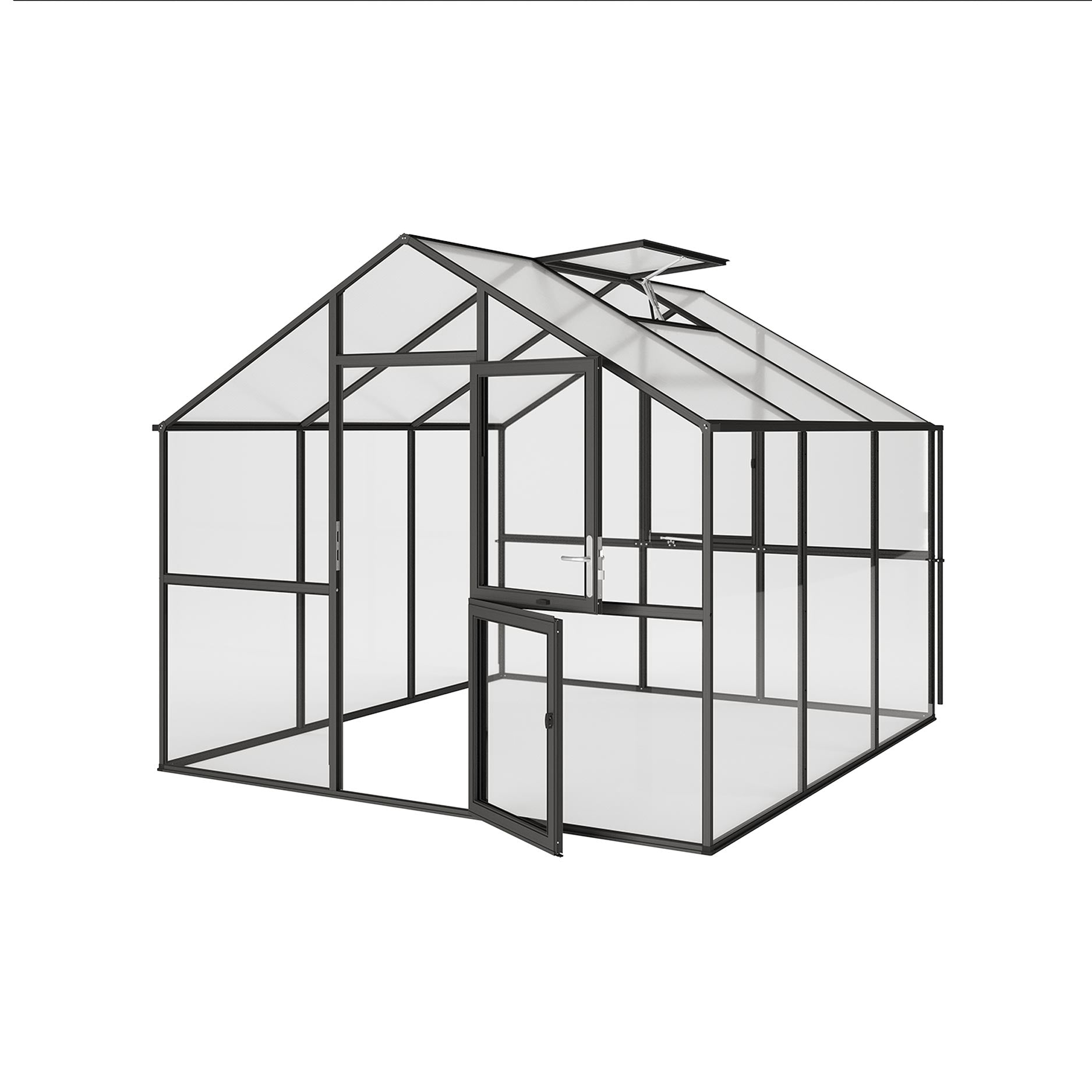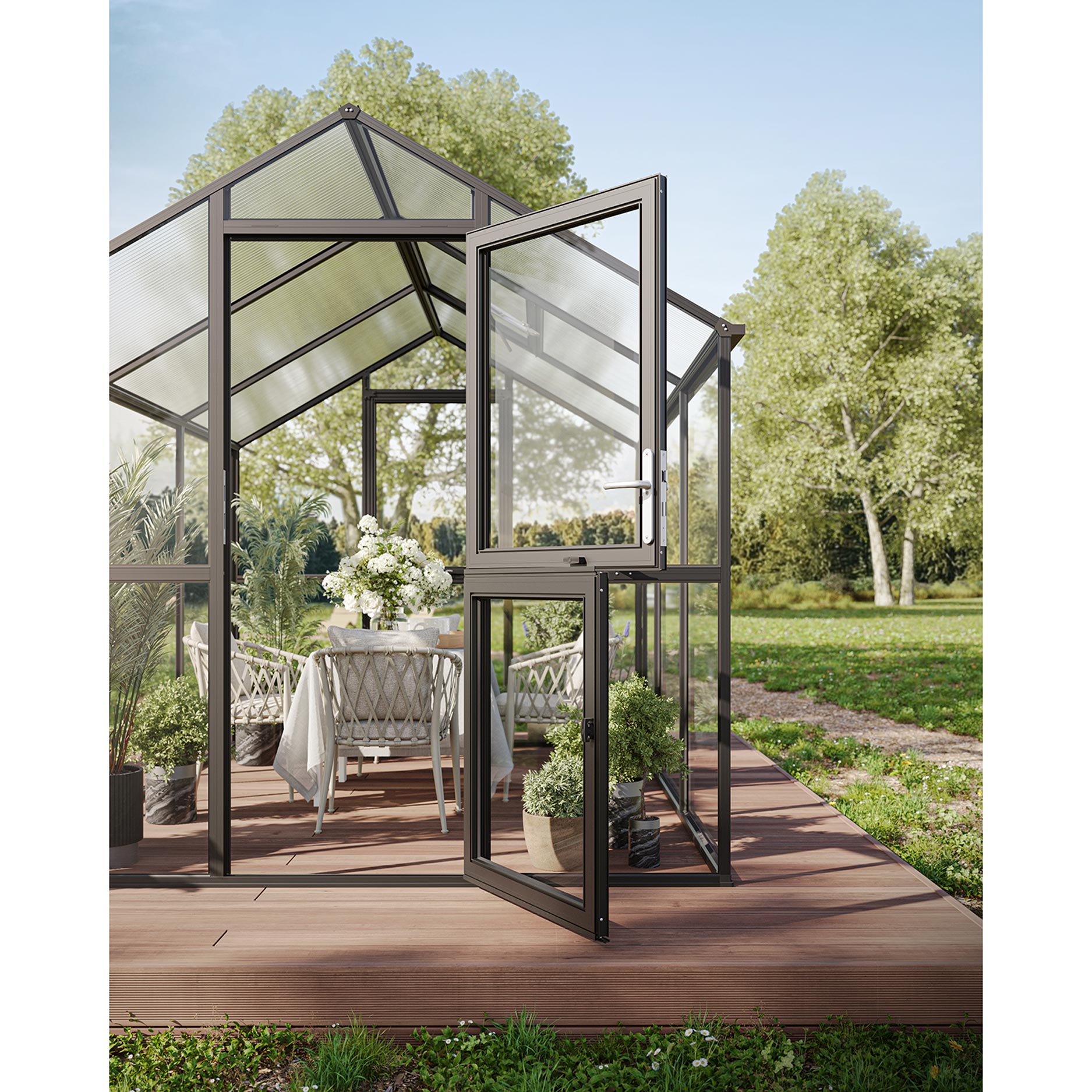 De kas is opgebouwd uit een robuuste aluminiumconstructie met 4mm veiligheidsglas in de zijwanden en 10mm kanaalplaten in het dak. Deze combinatie biedt helder zicht en uitstekende isolatie. De Ortasia III is uitgerust met een brede draaideur met slot, een automatisch dakraam en een handmatig achterraam voor optimale ventilatie. Geïntegreerde regengoten met aluminium regenpijpen zorgen voor efficiënte waterafvoer. Het optionele funderingsframe garandeert een stabiele plaatsing en verlengt de levensduur van de kas.