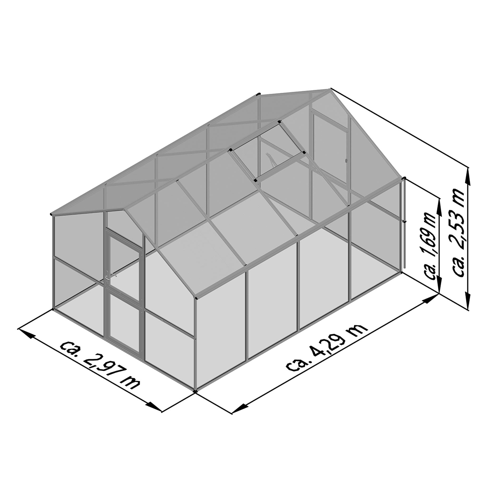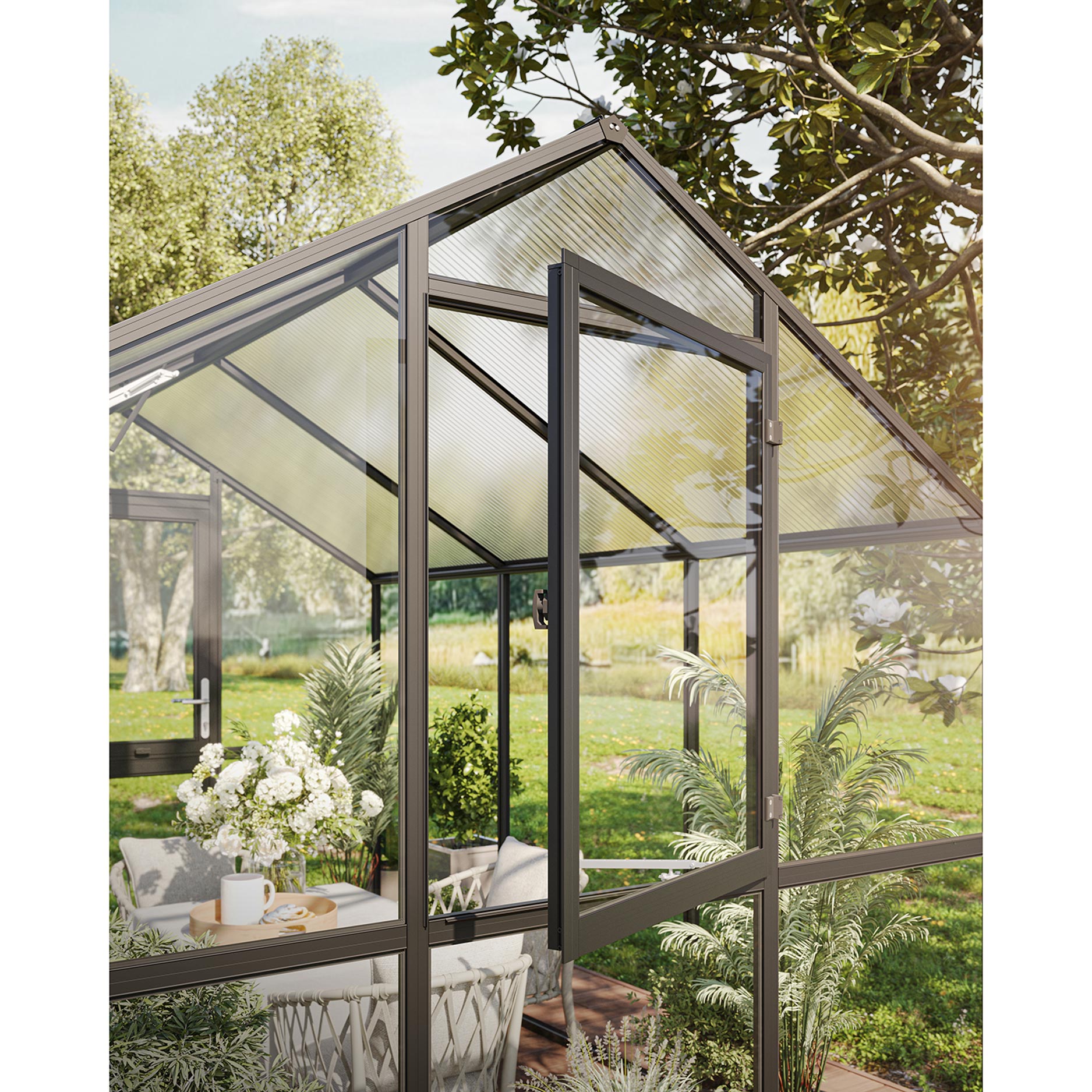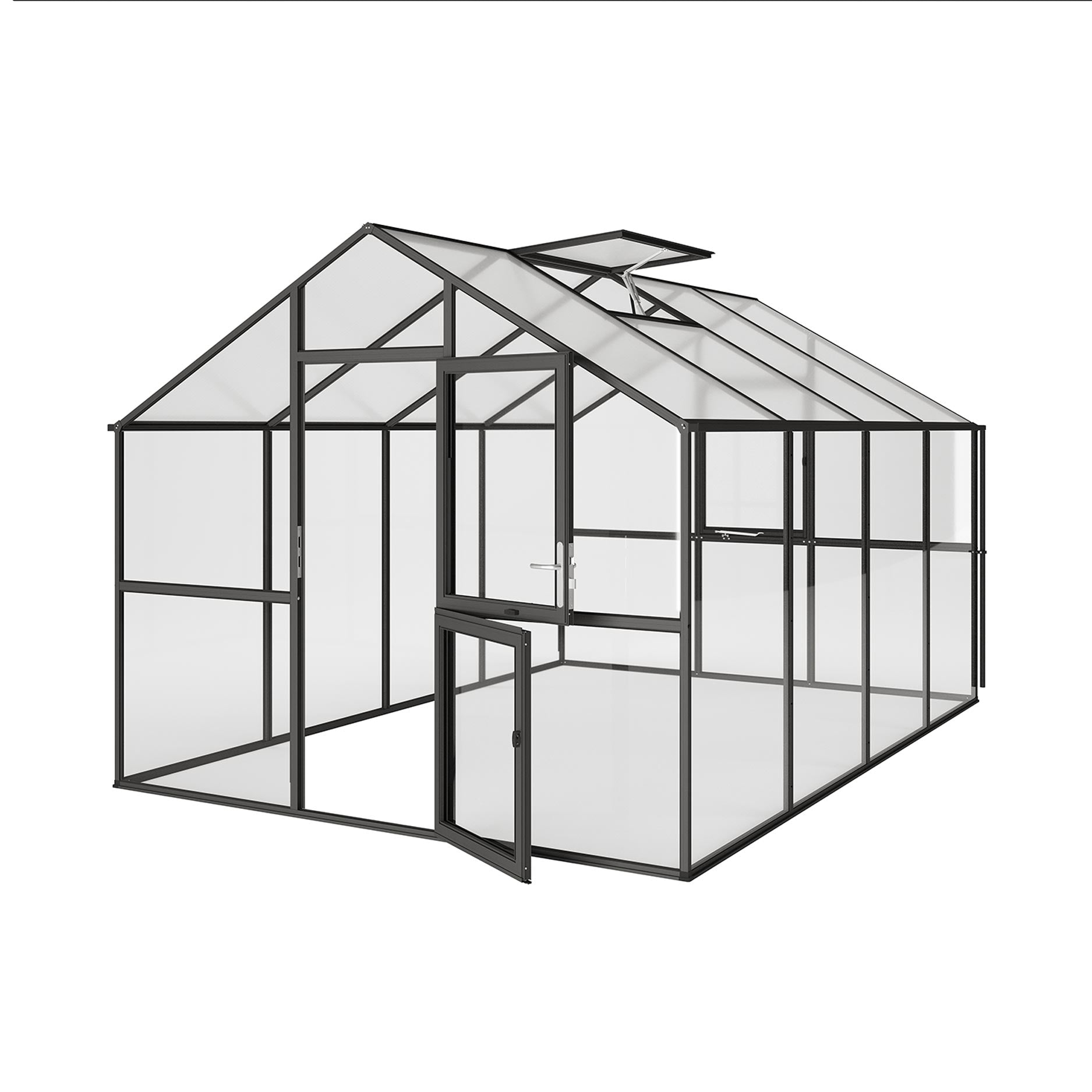 De aluminiumconstructie is bijzonder stevig en bestand tegen zware belasting. De wanden bestaan uit 4mm veiligheidsglas, het dak uit 10mm kanaalplaten met UV-bescherming. Deze combinatie biedt maximale lichtinval zonder warmteopbouw. De kas is voorzien van een brede draaideur met slot, twee dakramen (waarvan één automatisch), een handmatig achterraam en dubbele regengoten met regenpijpen. Het optionele funderingsframe biedt extra stabiliteit en duurzaamheid.
