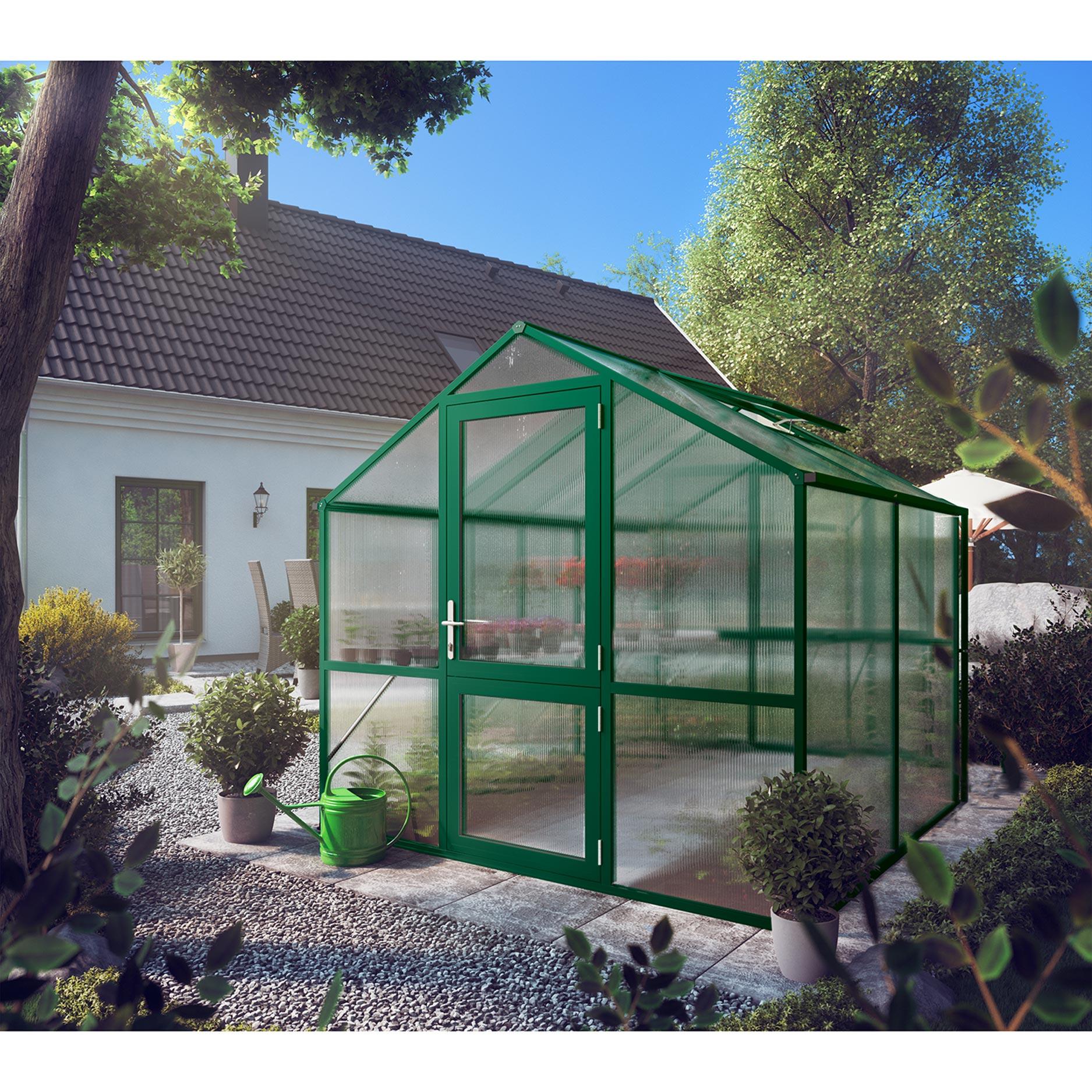 De aluminiumconstructie is robuust en onderhoudsarm, ontworpen voor jarenlang intensief gebruik. De beglazing bestaat uit 10mm kanaalplaten, die een uitstekende balans bieden tussen lichtdoorlaat, warmtebehoud en stevigheid. Dit maakt de Rose II geschikt voor het opkweken van jonge planten, het kweken van tomaten of pepers, of het beschermen van gevoelige gewassen in de herfst. De draaideur en het dakraam zorgen voor een aangename luchtcirculatie, terwijl regengoten het water efficiënt afvoeren. Met het optionele funderingsframe staat de kas perfect stabiel en waterpas.