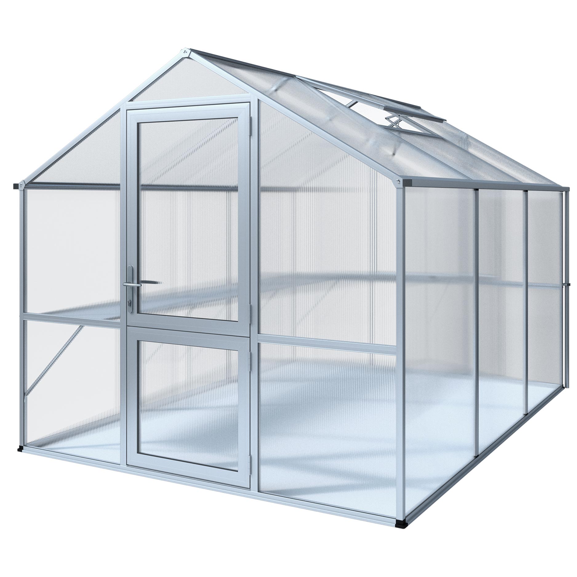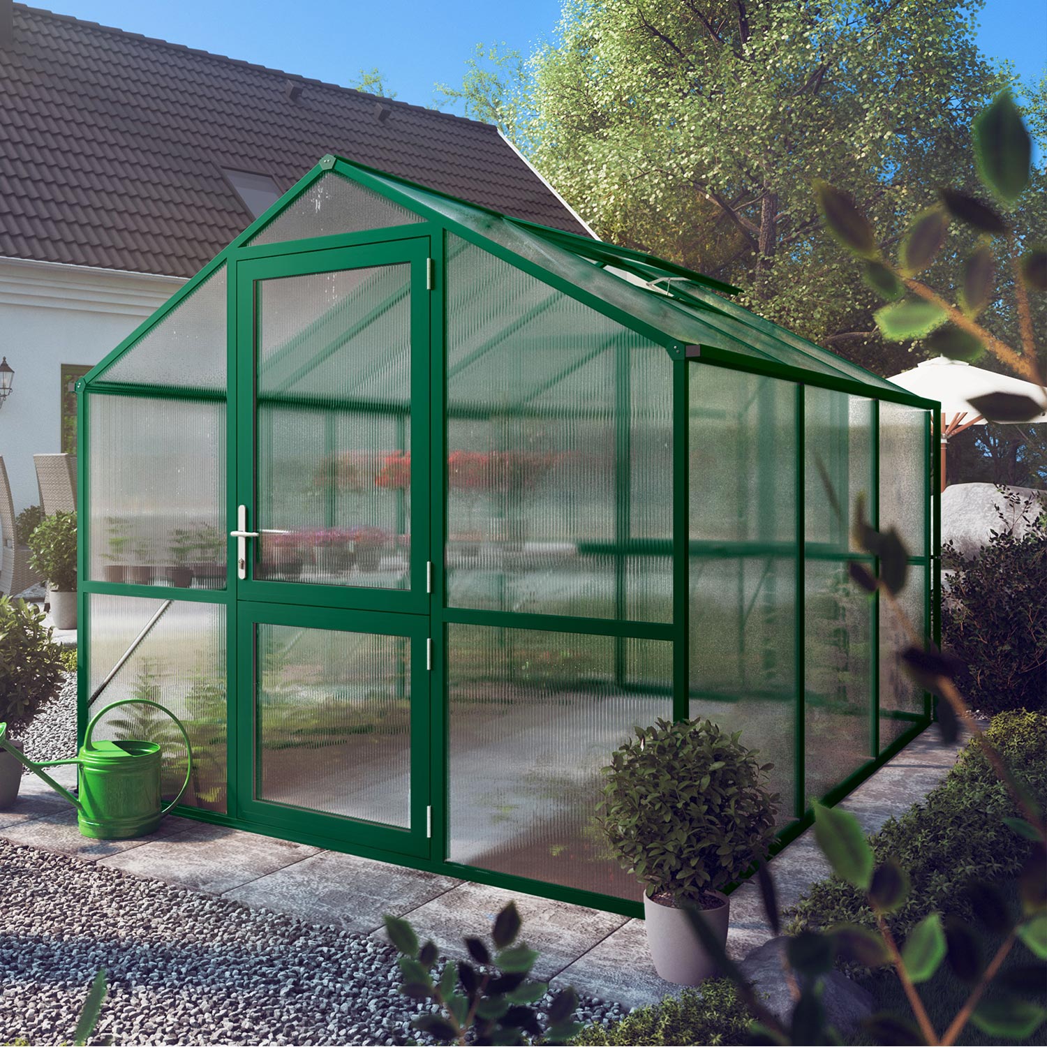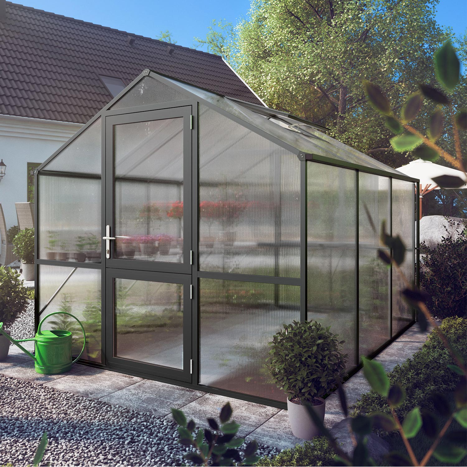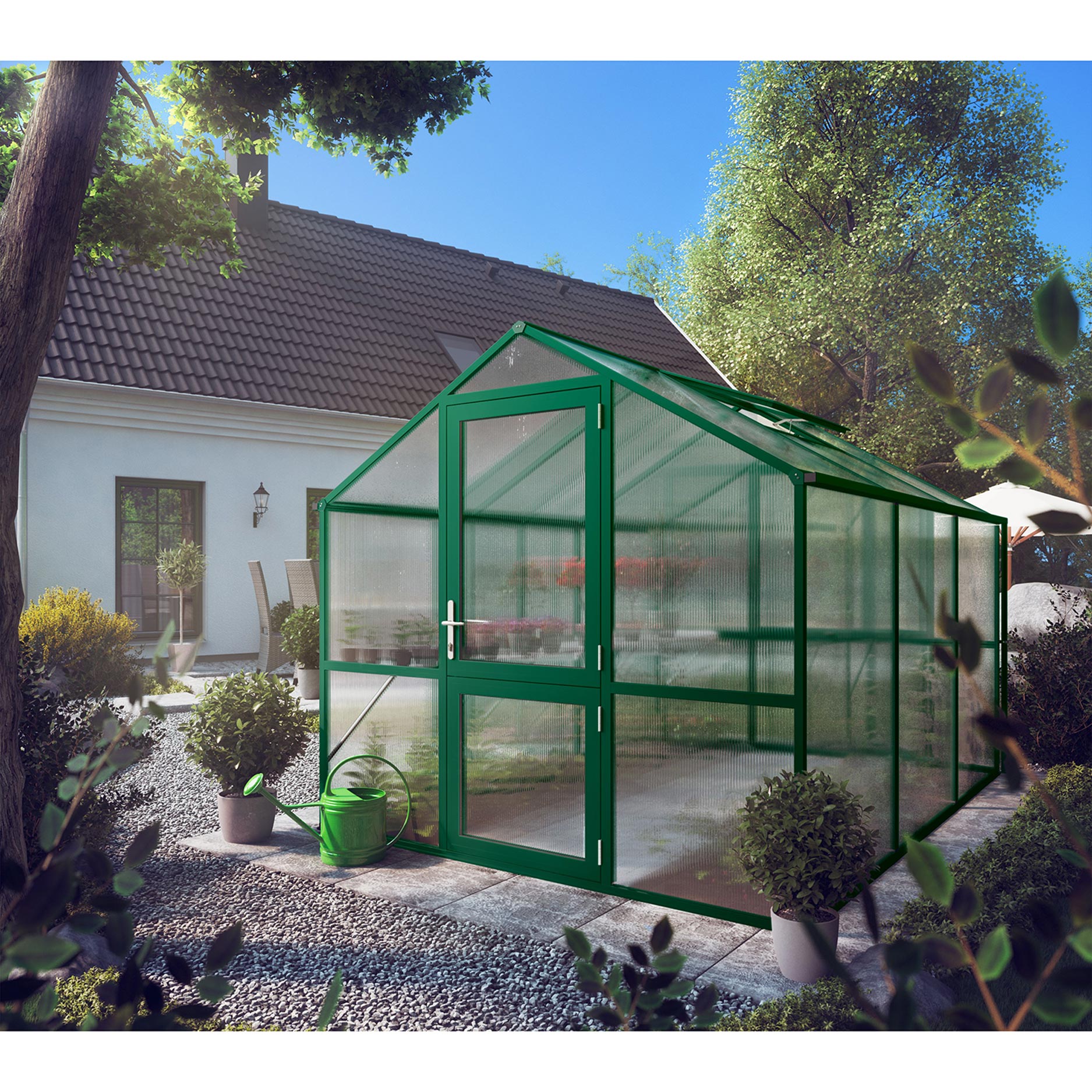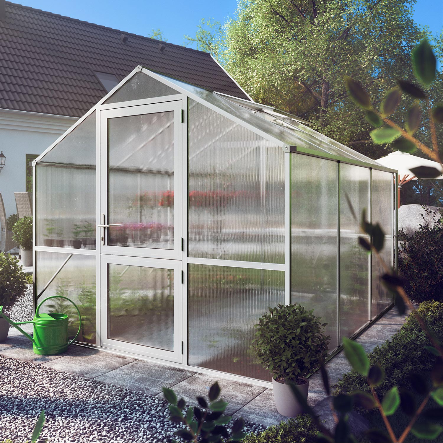 De constructie is gemaakt van stevig aluminium, licht van gewicht maar uitzonderlijk sterk. De 10mm kanaalplaten houden warmte vast en verminderen temperatuurschommelingen, wat vooral waardevol is in het vroege voorjaar en late najaar. Dankzij de UV-bescherming blijven platen helder en behouden ze jarenlang hun isolerende werking. De brede draaideur en het ruime dakraam bieden comfortabele toegang en ventilatie. Via geïntegreerde regengoten wordt water afgevoerd of opgevangen voor hergebruik. Met het funderingsframe ontstaat een solide en duurzame basis die bestand is tegen intensief gebruik.