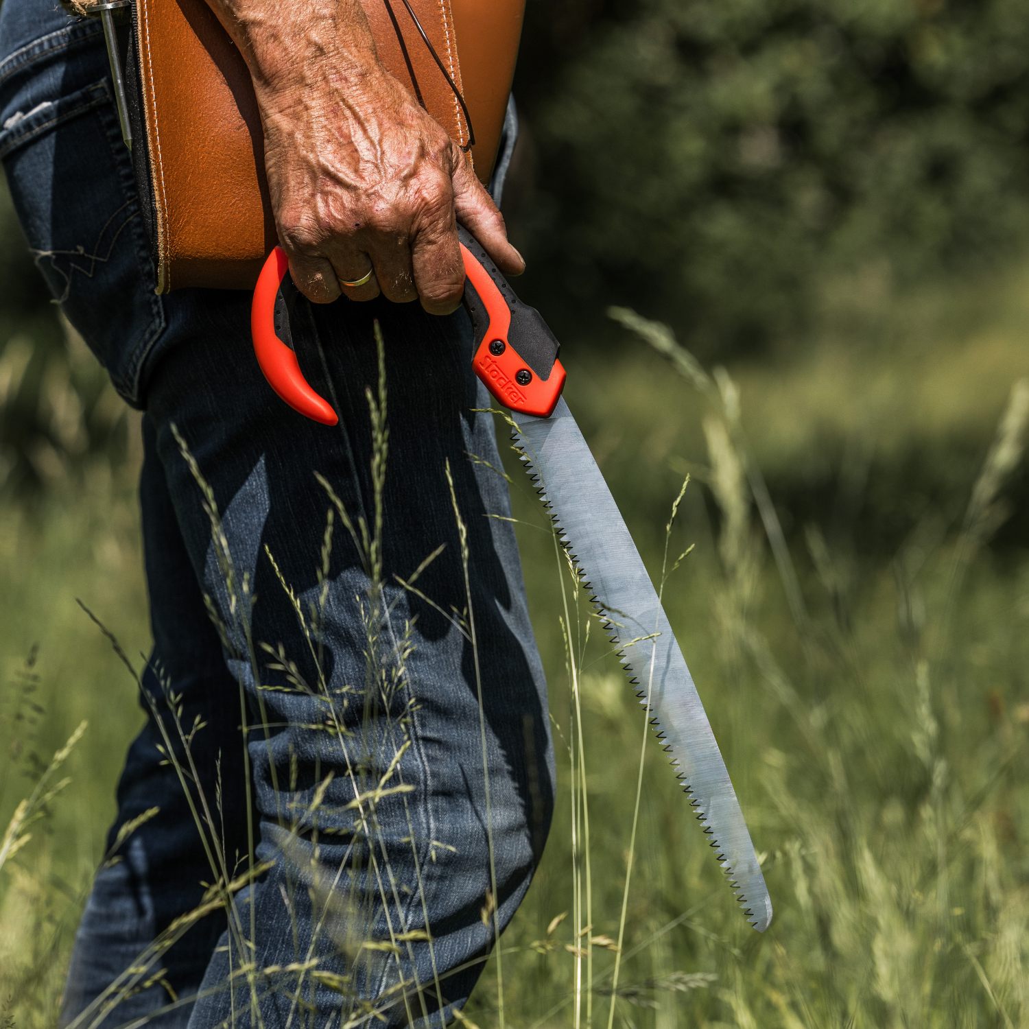 Een praktische handzaag met parapluhandvat en verchroomd vast zaagblad. De impulsgeharde tandpunten garanderen een lange levensduur en duurzaamheid. De superlichte parapluhandgreep zorgt voor een stevige grip en geeft de mogelijkheid om te zagen in alle hoeken en standen.