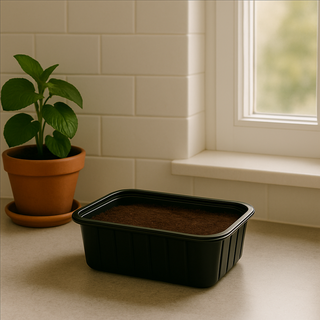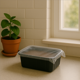 Plaats het bakje met voedingsbodem op een lichte plek, maar niet in direct zonlicht. Ideaal is een plek met een temperatuur tussen 18–22 °C.