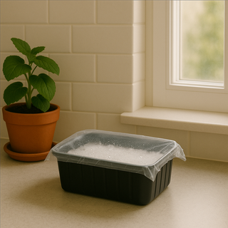 Wanneer het substraat volledig wit gekleurd is, verwijder je de afdekking en zorg je voor een hogere luchtvochtigheid. Zet eventueel een doorzichtige plastic zak losjes over de set om een minikasje te maken.