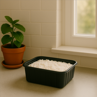 - Je kweekset (bakje + voedingsbodem + gebroed)