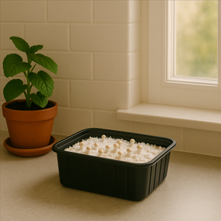 Binnen enkele dagen zie je kleine paddenstoeltjes (pins) verschijnen. Houd het substraat vochtig en de lucht fris zodat ze goed kunnen uitgroeien.