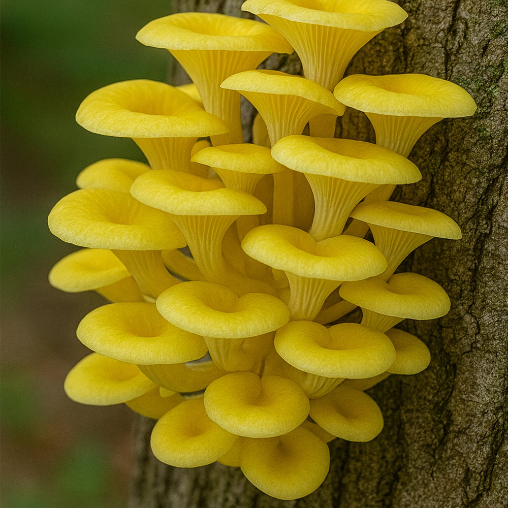 De gele oesterzwam (Pleurotus citrinopileatus) is een echte blikvanger onder de paddenstoelen. Met zijn zonnig gele hoedjes en verfijnde structuur geeft hij kleur én smaak aan elk gerecht. Deze biologische variant wordt volledig zonder chemische bestrijdingsmiddelen of kunstmest gekweekt, waardoor de smaak zuiver en delicaat blijft. Gele oesterzwammen hebben een zachte, licht nootachtige smaak met een vleugje citrus en zijn populair in de Aziatische keuken.