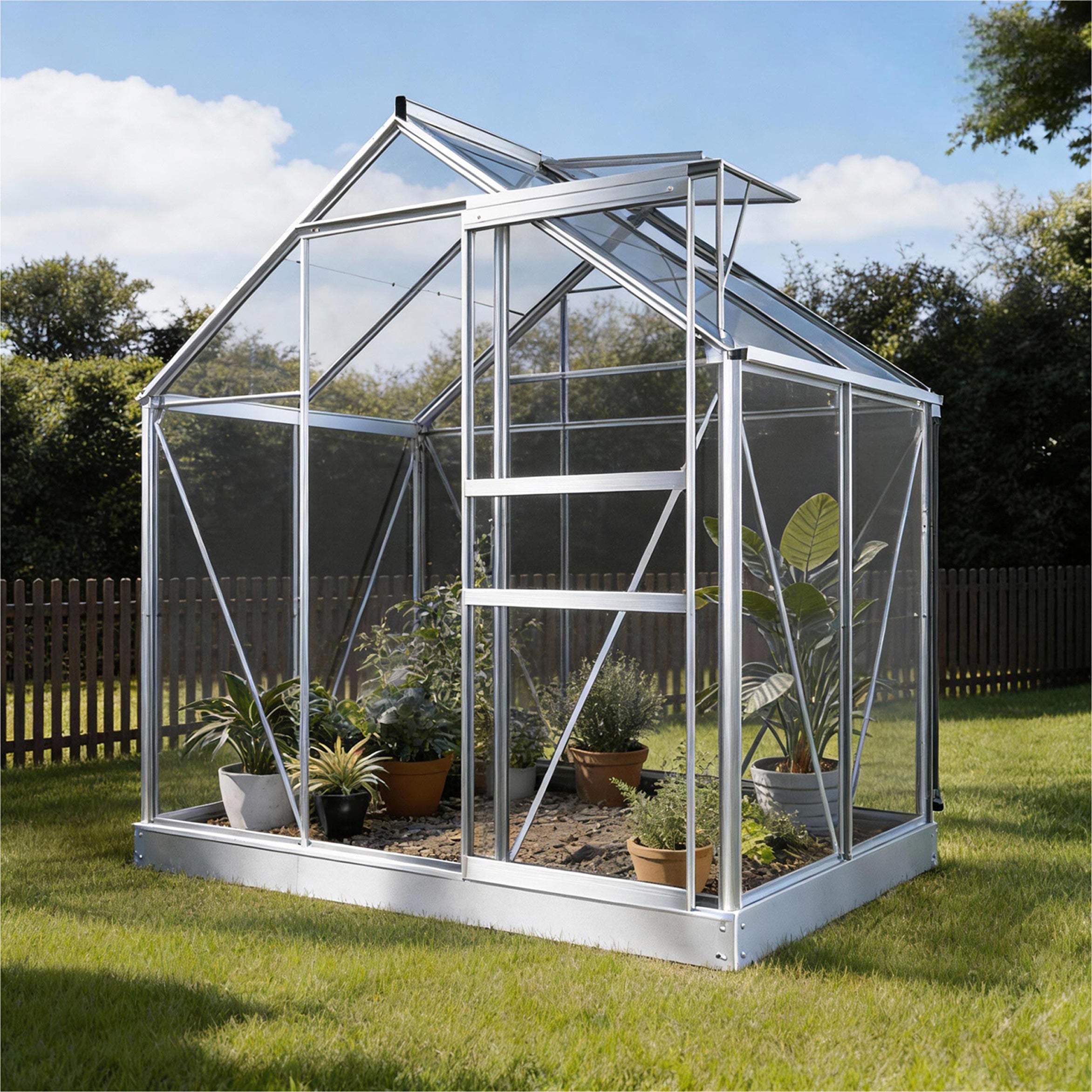 De aluminiumconstructie voelt degelijk en stabiel aan, met veiligheidsglas van 3mm dat veel licht doorlaat en eenvoudig schoon te houden is. De schuifdeur en het dakvenster zorgen voor natuurlijke ventilatie en een prettig binnenklimaat. Het funderingsframe en de hemelwaterafvoer zijn standaard inbegrepen, zodat de kas meteen gebruiksklaar is. Klein in formaat, maar groots in mogelijkheden.