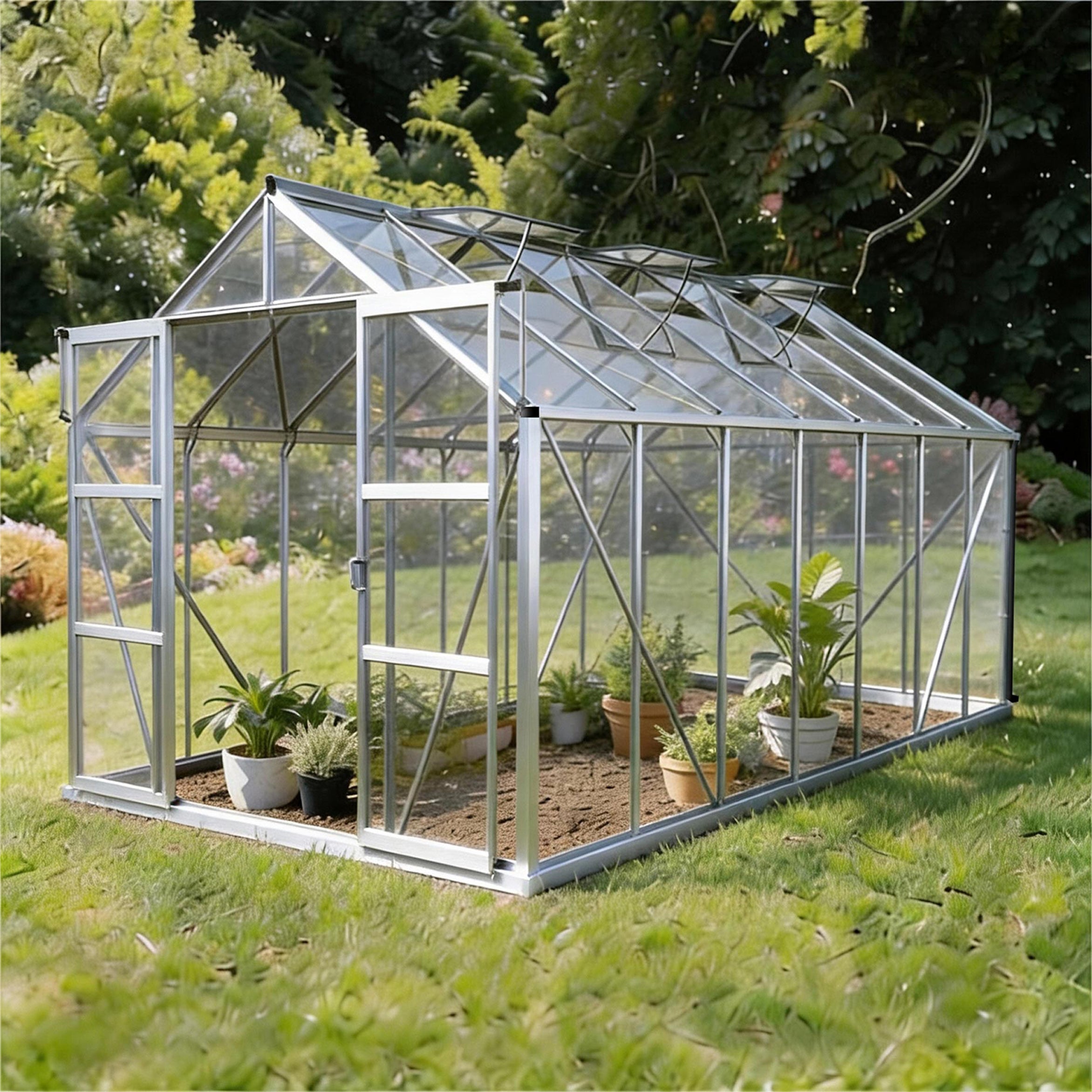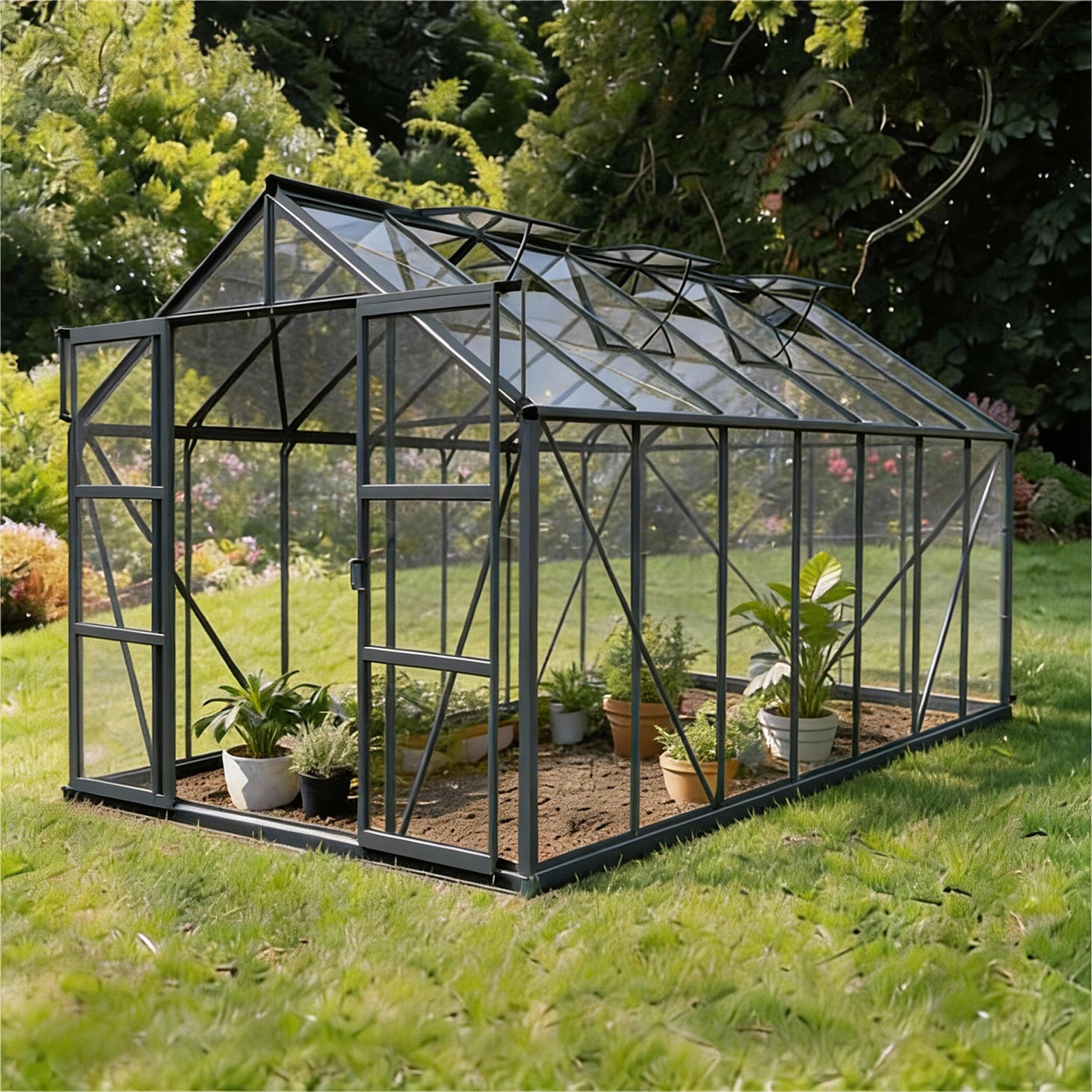 De aluminiumconstructie met veiligheidsglas is ontworpen voor stabiliteit en langdurig gebruik. De dubbele schuifdeur geeft makkelijke toegang, en de zes dakvensters zorgen voor uitstekende luchtcirculatie. De hemelwaterafvoer en het funderingsframe zijn standaard inbegrepen, wat deze kas tot een duurzame en complete oplossing maakt.