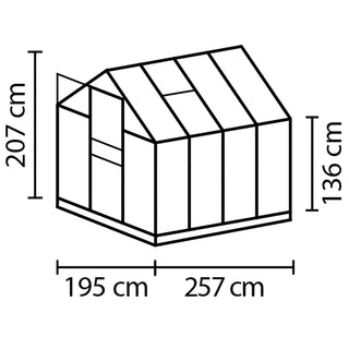 De aluminiumconstructie is onderhoudsarm en degelijk. Dit model wordt standaard geleverd met een funderingsframe wat de montage vereenvoudigt en de levensduur versterkt. De beglazing is beschikbaar in twee varianten: volledig 6mm kanaalplaten voor goede isolatie, of helder veiligheidsglas voor maximale lichtinval. De panelen worden bevestigd met de klemverenconstructie. Het glas of de kanaalplaat wordt stevig tegen het frame gedrukt en vastgeklemd met veren tussen profiel en lijst, wat zorgt voor stabiliteit en eenvoudig onderhoud. De enkele schuifdeur biedt gemakkelijke toegang. Ventilatie wordt verzorgd door het dakraam en geïntegreerde regengoten voeren water netjes af.